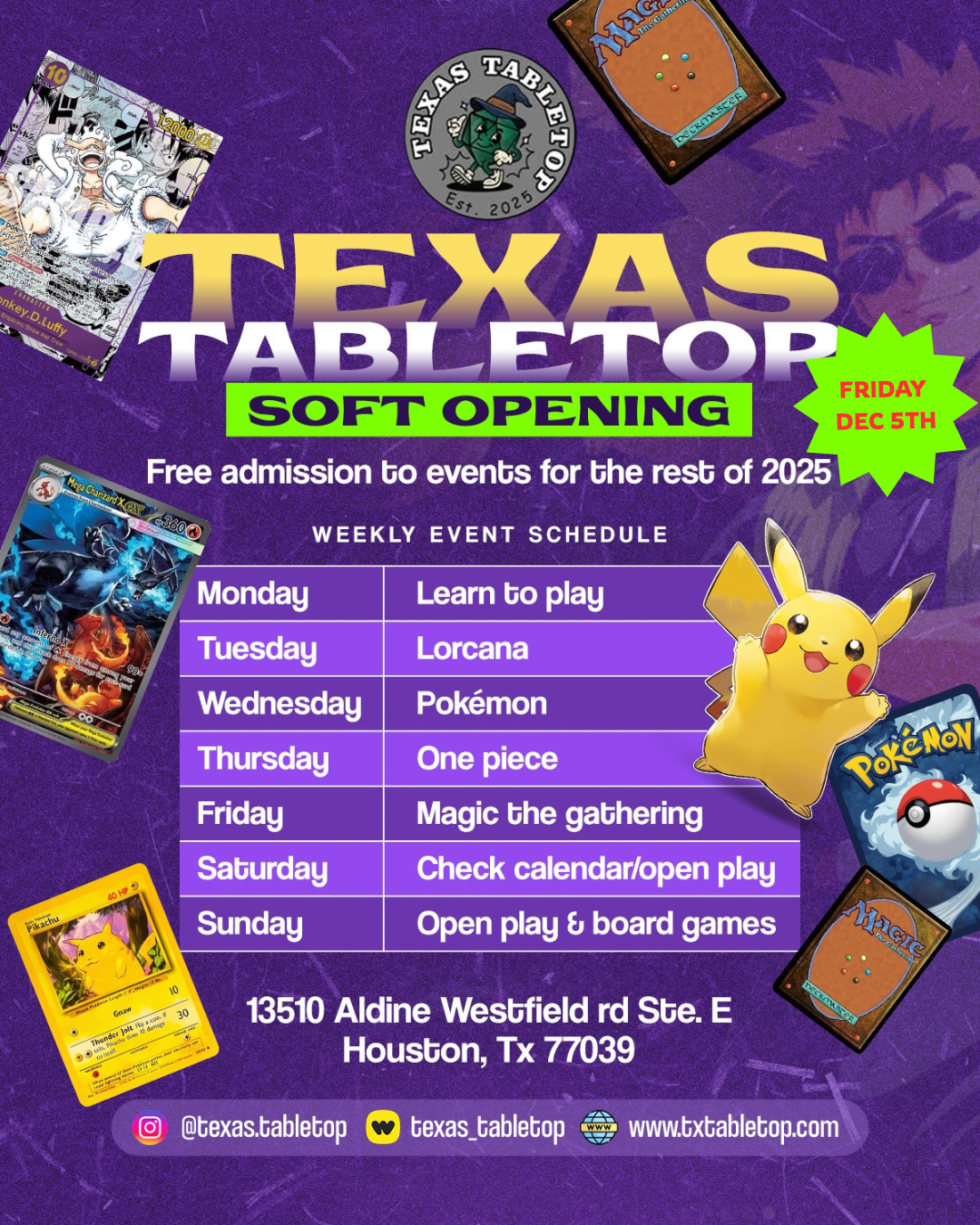 At the moment this will be our weekly repeating calendar, but bare with us and well work our a fully fledged monthly calendar with current events and tournaments. if you would like to stay updated on the store and its new events Follow us on instagram: @texas.tabletop